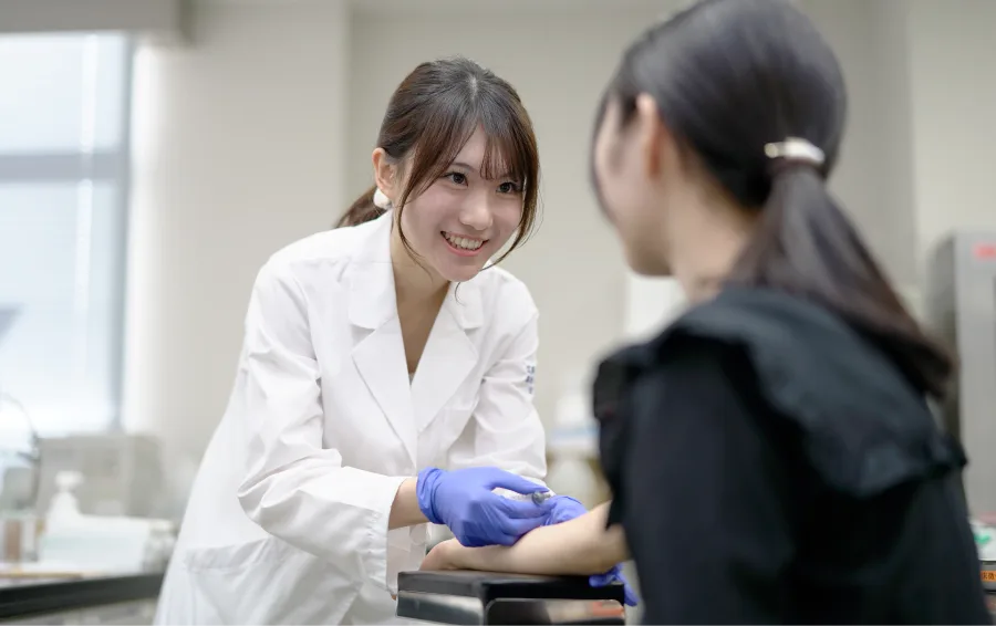 2年生の「一般検査学実習」という授業では、自分や友達の検体を使って実習を行います。採血をするにあたって、最初は人形で練習するのですが、最終的に友達に針を刺して採血します。自分や友達の検体を使って検査をするので楽しく印象的な授業の一つです。