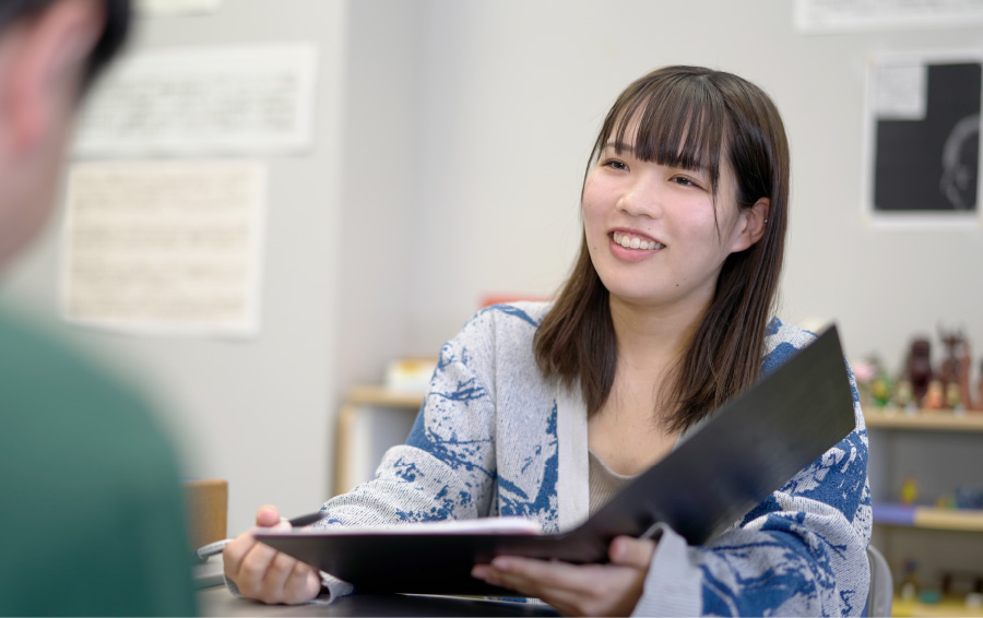 大阪府出身の富松咲和さんは「カウンセラー」をめざし、心理学科に通う2年次(取材時)です。富松さん自身の経験と、ヒロコクで修得した心理学の知識が合わさって、お話を聞いているうちに、私たちがカウンセリングしてもらっている気分になりました。