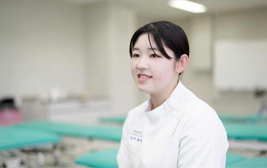 実習で苦労したことは、自分の体勢の作り方です。いろんな患者さんがいて、自分より大きな人から、小柄な人まで、体型に差があります。それに合わせて自分の身体の使い方を変えないといけない点は、難しいと感じました。他にも実習に行くと自分の未熟な部分もわかるので、もっと色んなことを学ぼうって気持ちが引きしまります!